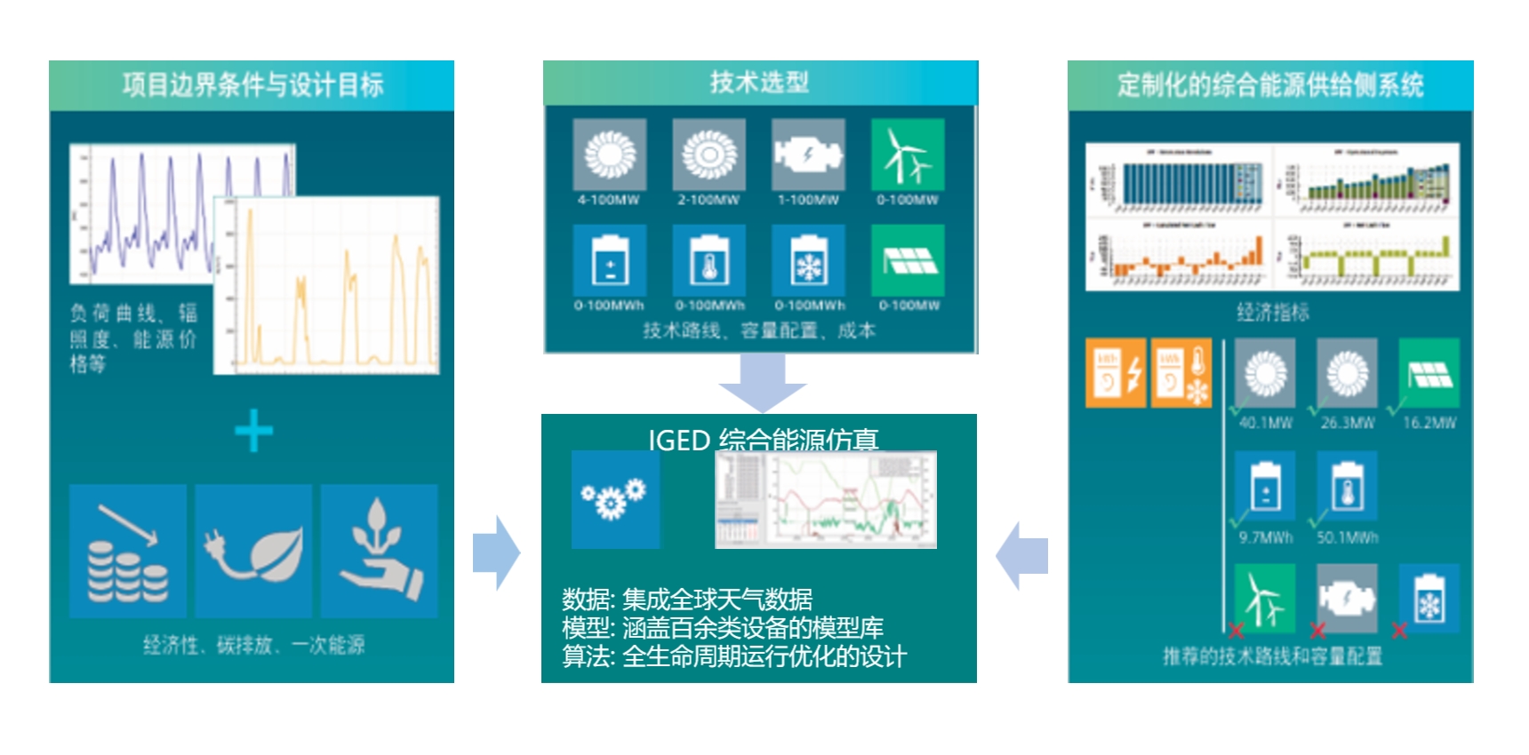 IGEP is a specialized simulation tool designed for integrated energy and microgrid systems. The software features a robust and comprehensive model library that encompasses nearly all energy equipment and conversion technologies involved in distributed energy systems. For specific projects, designers can conduct thorough research on local resource endowments, commodity prices, load types and demands, weather environment data, user requirements, etc., to determine project boundary conditions. Based on certain planning and design objectives (such as optimizing overall economics or minimizing energy consumption and carbon emissions), optimal design methods are used to derive parameters such as technology selections and equipment capacities suitable for the specific project.