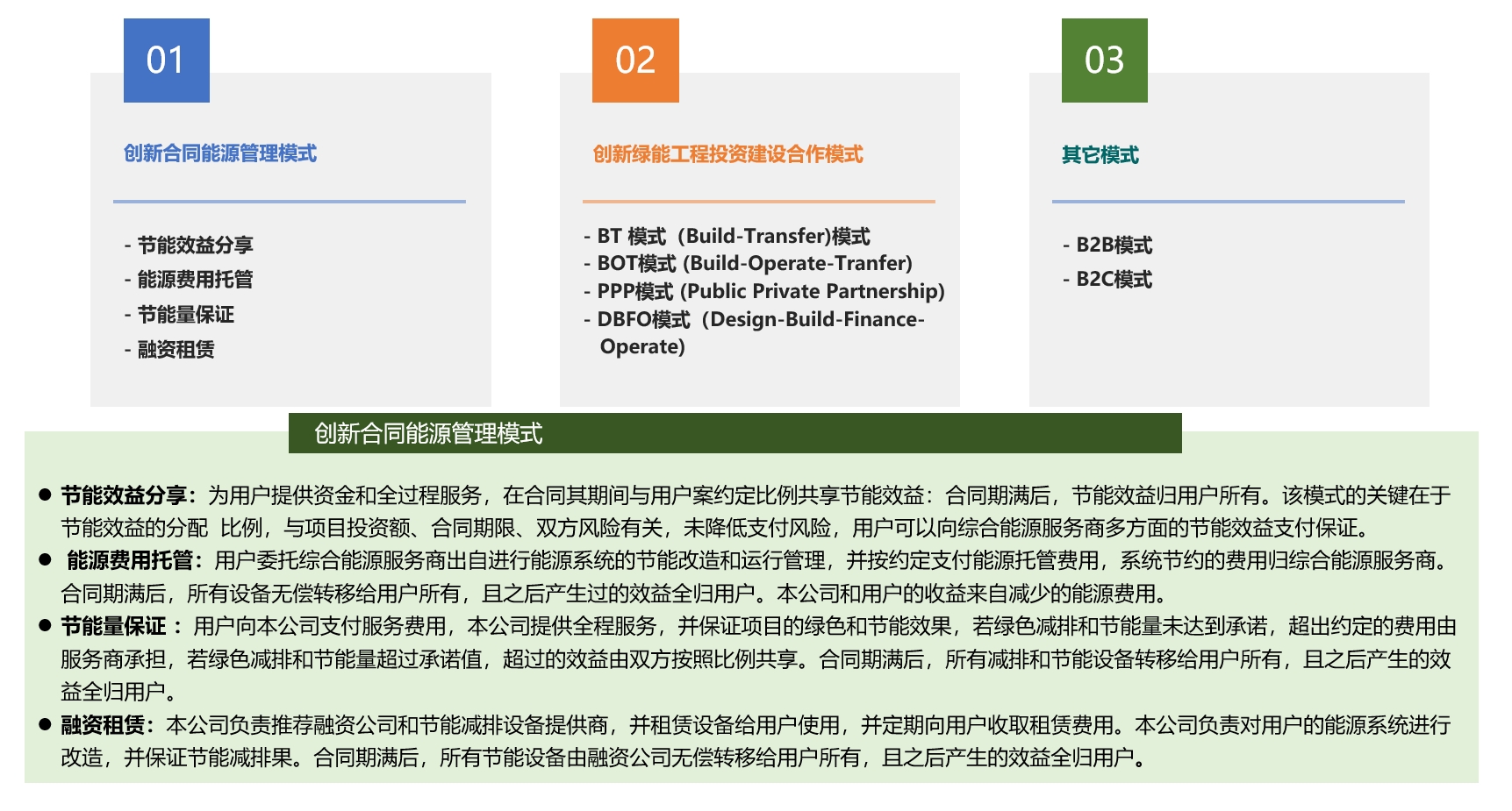由政府授权本公司负责开展绿色能源项目的融资和建设,并在规定时限内将竣工后的项目已交给政府,政府根据事先签订的回购协议分期向本公司支付项目总投资及相应回报。